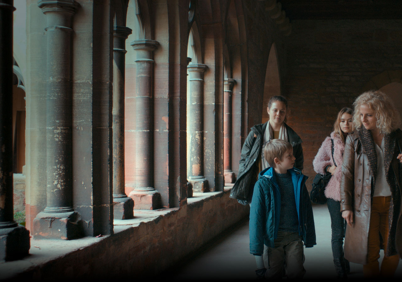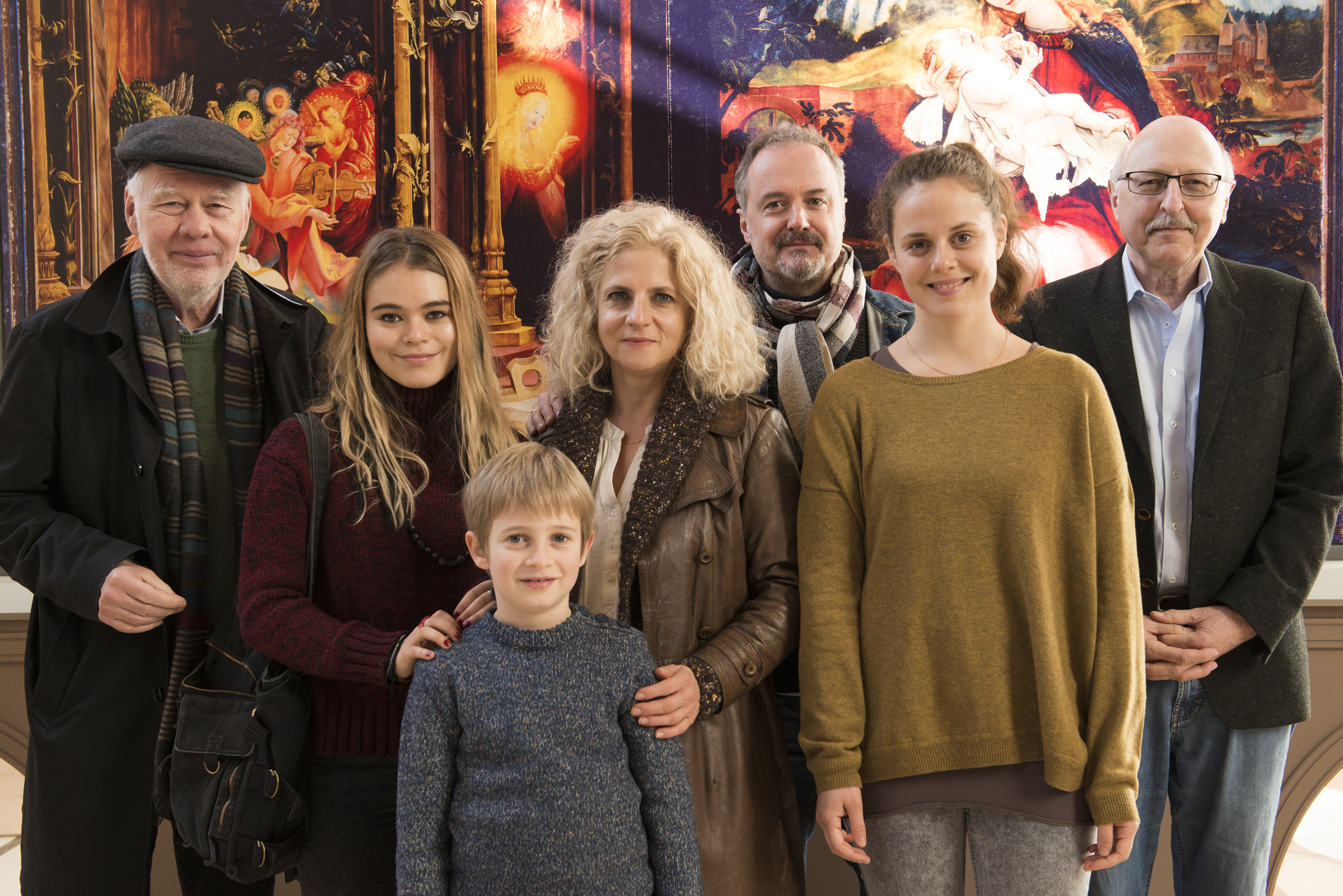 (f.l.t.r.) Lukas Hartmann (Author of novel, which the film was based on), Chiara Carla Bär (“Alice Hess”), Noé Ricklin (“Yves Zanini”), Eleni Haupt (“Eliane Hess”), Stefan Haupt (Director), Elisa Plüss (“Helen Hess”) and Rudolf Santschi (Producer) while filming “Dark Fortune” on 8. November 2015 at Museum Unterlinden, Colmar, France. © TRILUNA FILM / Aliocha Merker